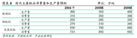 預計06 年紙漿價格因成本居高不下而維持現有水平。國內主要紙品盡管新增產能不斷涌現,但由于多數品種仍然供不應求,主要紙品價格呈現下滑態勢,且下滑程度有所減輕。原材料、能源價格上漲和運輸成本不斷上升導致紙品生產企業競爭壓力加大。企業盈利分化成為必然。優勢造紙企業將通過加強成本管理和提高紙漿自給率來提升競爭力,并逐步完成行業整合的重任。目前國內上市公司均加大了林紙一體化的投資力度,晨鳴紙業、華泰股份、岳陽紙業和美利紙業等公司均有自己的種植林基地。掌握紙漿資源是造紙企業未來持續發展的根本。