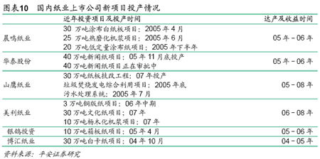 晨鳴紙業和華泰股份就是憑借各種優勢發展壯大起來。05 年晨鳴紙業更加速了其擴張戰略的迅猛勢頭。即投資到年產30 萬噸涂布白紙板項目等多個項目后,又耗資7.4 億元收購*ST 吉紙。2005 年底,公司又中標了投資總額94 億元、號稱國內最大紙漿項目之一的廣東湛江木漿項目。華泰股份(600308)也加快產能擴張的步伐。公司40 萬噸新聞紙于2005 年11 月投產,并另有40 萬噸新聞紙在計劃審批中。目前,多家上市公司均有在建和新投產項目,預計未來業績增長將有明顯的提升。