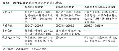 在國際造紙巨頭相比,國內造紙企業還處于幼兒期。國家在政策和環境方面給予保護。長達五年的銅版紙、新聞紙和未漂白牛皮箱紙板反傾銷保護已經啟動。可以看到,我國商務部的反傾銷措施已經基本上覆蓋了整個造紙行業的主要類別,在這種政策的保護下,造紙行業將獲得相對寬松的競爭環境,一些有資源和規模優勢的紙類上市公司有望繼續獲得高速成長空間。