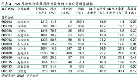 上市公司業績分化明顯。其中凈利潤增長較大的公司有福建南紙、銀鴿投資和博匯紙業等。福建南紙由于處理資產導致凈利潤 大增。銀鴿投資、博匯紙業、晨鳴紙業由于有新項目投產或達產使得凈利潤明顯增長。華泰股份和山鷹紙業由于產品價格上漲及成本控制得當凈利潤同比增長23.1%和52.5%。