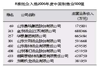 國家統計局依據2005年企業年報,按主營業務收入大小排序,首次向社會發布2006年度中國制造業500強;同時,按主營業務收入、資產總額和從業人員數三項指標劃定了2006年度中國大型工業企業共2387家。 山東晨鳴集團股份有限公司等32家造紙企業入選大型工業企業名單,其中前8名更入選了2006年度中國制造業500強;另有6家擁有年產5萬噸以上漿/紙項目、但主營業務不是造紙的企業入選2006年度中國大型工業企業名單。