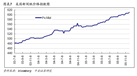 預計06 年紙漿價格因成本居高不下而維持現有水平。國內主要紙品盡管新增產能不斷涌現,但由于多數品種仍然供不應求,主要紙品價格呈現下滑態勢,且下滑程度有所減輕。原材料、能源價格上漲和運輸成本不斷上升導致紙品生產企業競爭壓力加大。企業盈利分化成為必然。優勢造紙企業將通過加強成本管理和提高紙漿自給率來提升競爭力,并逐步完成行業整合的重任。目前國內上市公司均加大了林紙一體化的投資力度,晨鳴紙業、華泰股份、岳陽紙業和美利紙業等公司均有自己的種植林基地。掌握紙漿資源是造紙企業未來持續發展的根本。