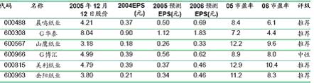 政策環境的助長企業做大做強。長達五年的銅版紙、新聞紙和未漂白牛皮箱紙板已經啟動。在這種政策的保護下,造紙行業將獲得相對寬松的競爭環境,一些有資源和規模優勢的紙類上市公司有望繼續獲得高速成長空間。預計06年紙漿價格因成本居高不下而維持現有水平。國內主要紙品價格仍將呈現下滑態勢,但下滑程度有所減輕。原材料、能源價格上漲和運輸成本不斷上升導致紙品生產企業競爭壓力加大。企業盈利分化將成為必然。優勢造紙企業將通過加強成本管理和提高紙漿自給率來提升競爭力,逐步完成行業整合的重任。